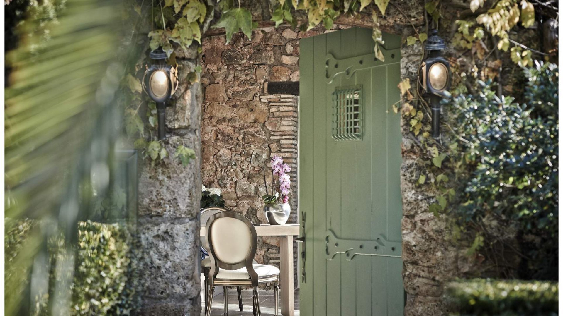 La terrasse ombragée surplombe le village médiéval et le Massif des Maures, et dans la salle en restanques aux voûtes centenaires, la cheminée crépite l'hiver.